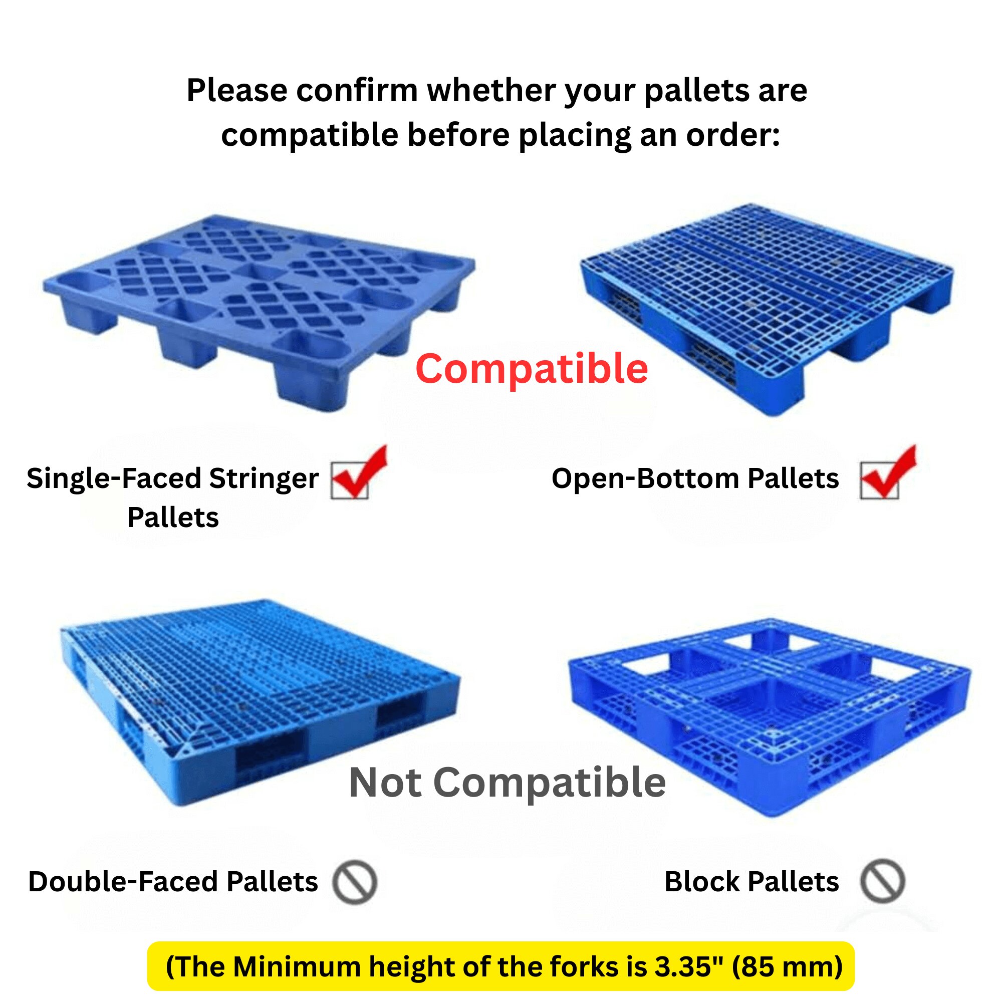 Please be noted the straddle legs are fixed for stability, so it is only suitable for open-bottom pallets.