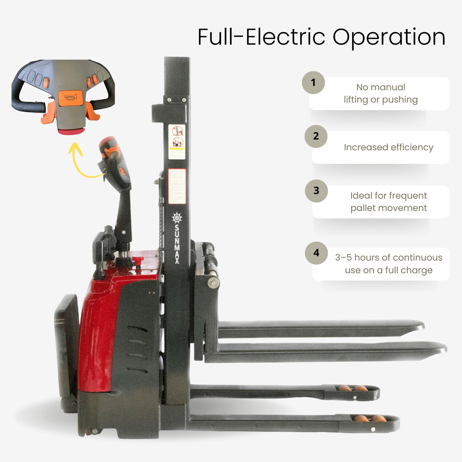 Full-Electric design ensures electric lifting and electric movement for complete operator ease.