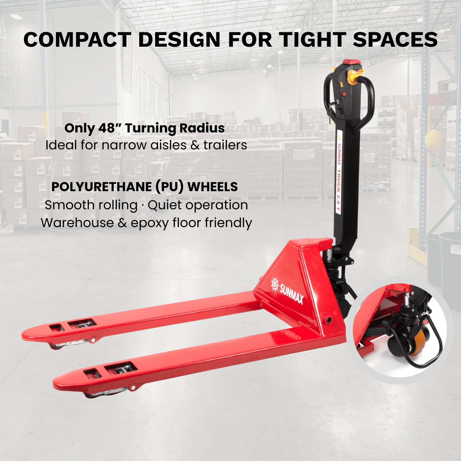 A compact frame and 48" turning radius allow the PT4400 to operate in narrow aisles, trailers, and confined warehouse spaces where larger equipment is impractical.