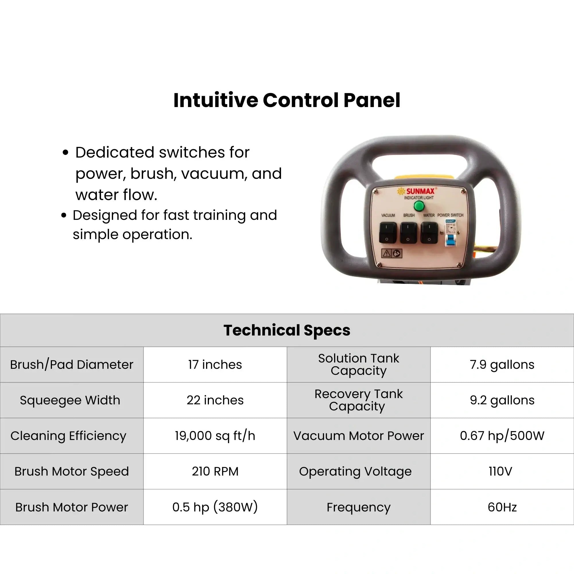 The 17" brush (210 RPM) scrubs away dirt and grime while the 22" curved squeegee and 500W vacuum motor instantly lift water into the recovery tank for streak-free, dry floors. No waiting—safe for high-traffic areas.